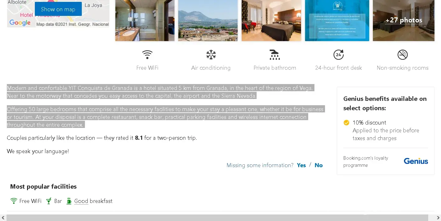 It cost 100 euros to stay in a hotel that Booking.com said was 4* that had no resturant and a snack bar that shut at weekends and I had to pay 51 euros because we had to leave Granada earlier than expected because of the false information