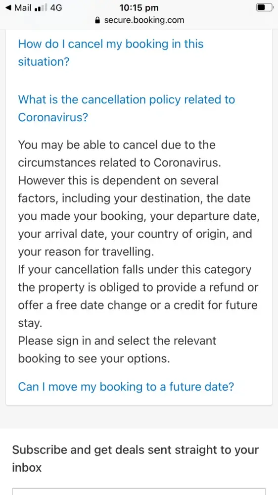 Booking.com has a policy specific for cancellation related to Coronavirus, attached to this email. It clearly states "if you cancellations falls under this category the property is OBLIGED to provide a refund, or offer a free date change or a credit for future stay". I have contacted your online support which has been unhelpful, I have asked them to send me a copy of our correspondence, as well as elevate the matter to their management and they have ignored my request outright. They have just said its up to the property. If that is the case then your website is misleading, we purchased through you specifically because of this policy and request a full refund. We will be taking this matter to consumer protection in Australia if it is not resolved within 5 business days.