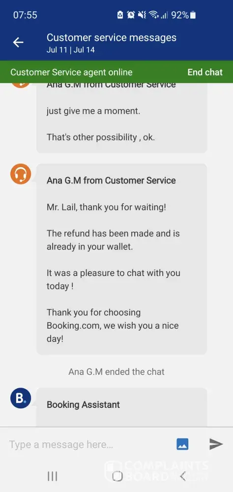 Desired outcome: refund or booking.