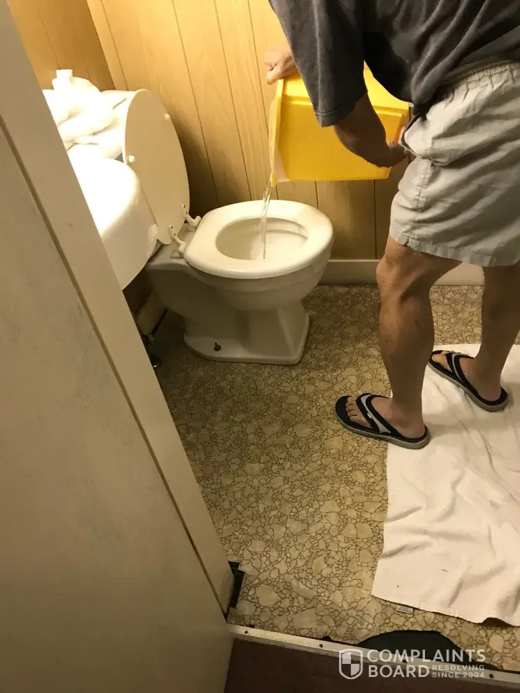 • Toilet in the 2-person unit did not work, the handle was connected inside with a thin rod and not a chain, hence, the toilet handle could not be turned to flush the toilet. The bucket in the bathroom used to flush the toilet was cracked. This posted a serious health concern.