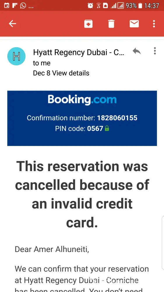 I made a reservation throw Booking.com by end of Sep, 2017 for the new year eve in Dubai at Hyatt regency hotel for 10 days, at that time the price was 3300$ for 2 rooms 3 adults 2 child, at the 2nd of Dec, I got an email from booking.com telling me that (you credit card is invalid) update or add new one, so I provide them with new credit card, 3rd of Dec, I get an email (credit card update successfully), at 8th of Dec, got an email from Hyatt regency says that my reservation was cancelled because of an invalid credit card, at this time the hotels prices were very high double or treble, and I had to make another reservation at another hotel because I was already bought the airplane tickets, and I pied for the new reservation 6000 $, at 10th of Dec, I got a massage from my bank with the first credit card says that I was charged 3000$ and I don't know way!