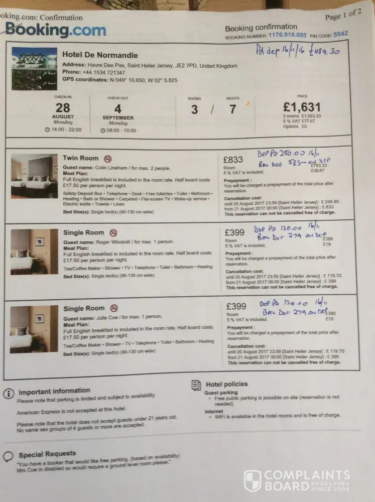 Booking number: 1176.919.095 Hotel de Normandie, Jersey 28th Aug - 4 Sept