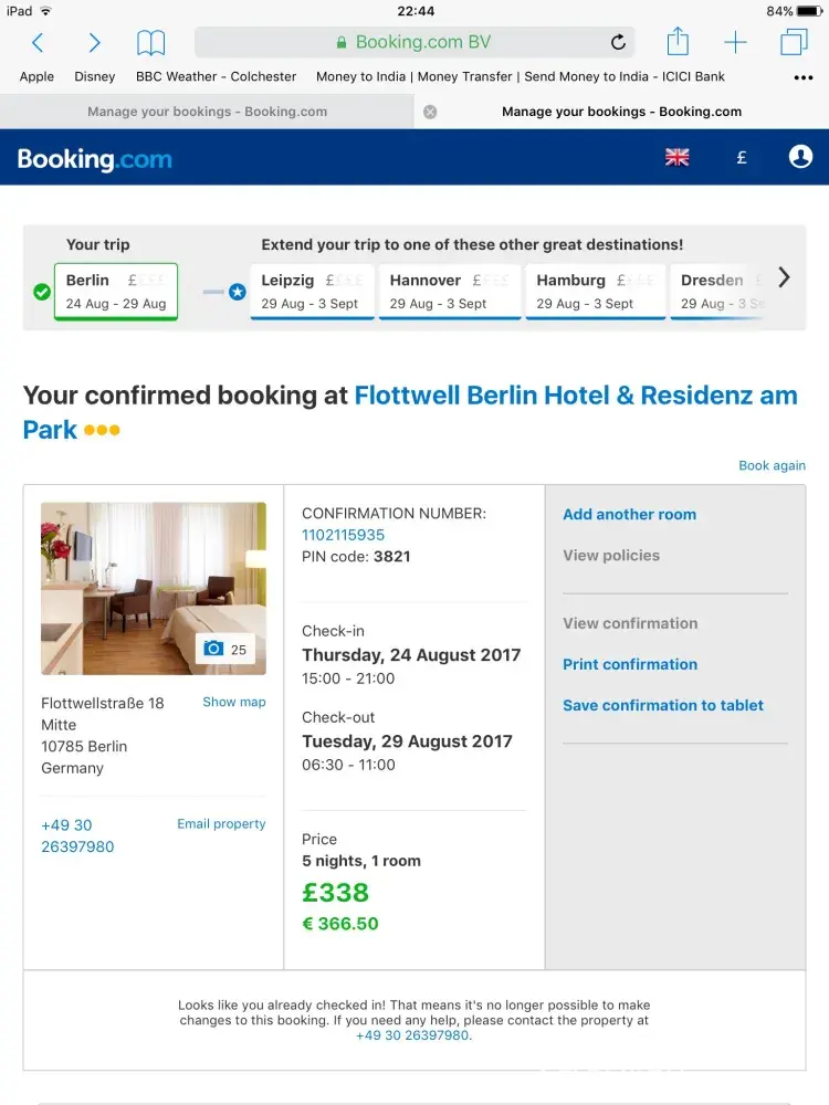 We booked self catering flat at 'Flottwell Berlin hotel & resident am park' Berlin on 29th July for 5 nights from 24th to 29th August for 2 people.