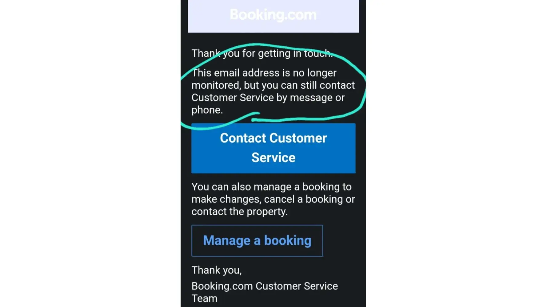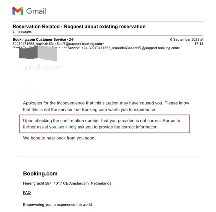 I am being charitable in stating that Booking.com has a Customer Service department. From what I have experienced they simply have an electronic process with FAQ prompts, and well names appear on their electronic replies requesting information, it is just a name. The reason for this is that none of them are tasked with your case, because any follow up when you get no reply starts the process all over again. So it is designed as a system to not only not service real customers, but to just have customers spinning their wheels in an effort to get real service. We have all experienced such frustration with being put on hold for extended periods of time, only to give up or get disconnected.