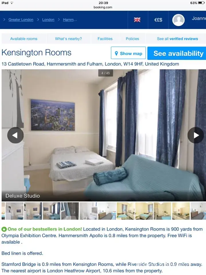 on the 24th september my daughter wanted to treat her boyfriend my daughter paid for a lovely room it had aurdrey hepburn pic on the wall looked gorgeous but my daughter got a room at the back of the appartment type block near to the place she booked the place was filthy had flies and stunk of we can show pics of what she ordered and what she got know i hear booking.com is not abta protected and these places can falsely show clean tidy places when its actually stinky room with flies you will get photos of the room she booked the second picture was the room she got so sad as she is only 18 years old and dont have any money as she dont work it just makes me annoyed the never gave her money back.