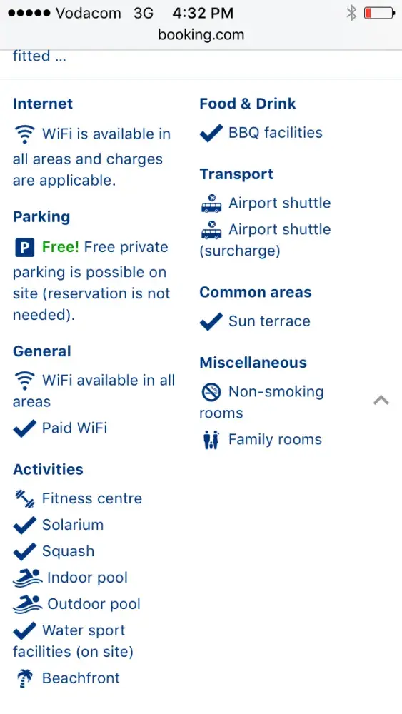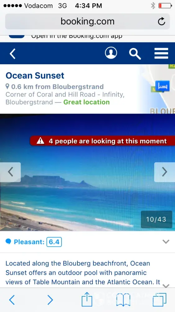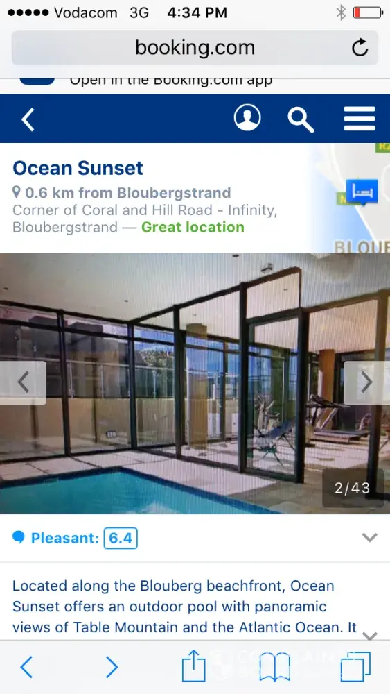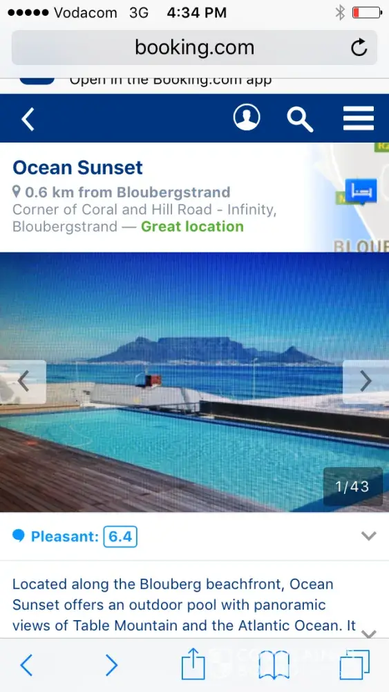 On christmas day we arrive in bloubergstrand, south africa at the said location attached to the apartments called ocean sunset. We were very happy as the apartment building was beautiful and had a big pool and was beachfront as stated in the booking.com page and matched the original pictures. We were early and the agent said she would meet us at a later time to check in and give our keys. We proceeded to have christmas lunch.