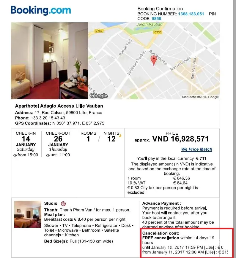 I booked a room of Aparthotel Adagio Access Lille Vauban from jan 14 to Jan 26, 2017 on booking.com in cancellation cost they said(piture 1) : free cancellation within 14 days (Jan 10 ), after that(from Jan 11) i will be charged 215 eur.