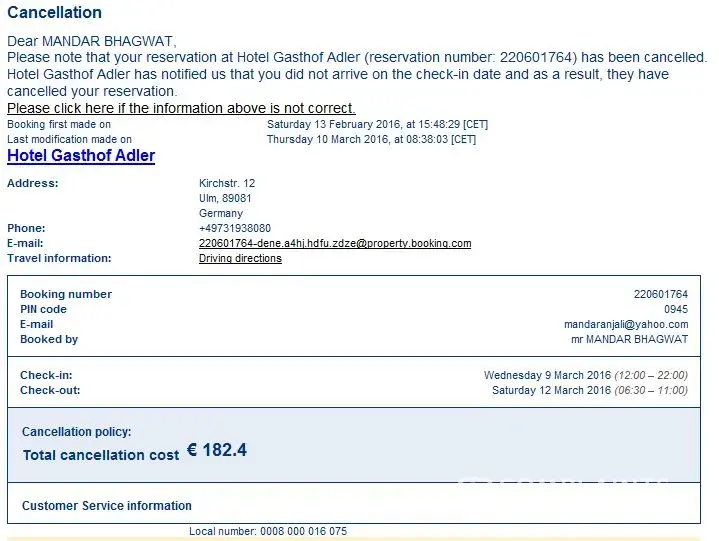 I had booked room for 3 nights(9th March to 12th March)at Hotel Gasthof Adler in Ulm-Gemany (Booking No. [protected]). Unfortunately was delayed in transit and on arrival at hotel, was informed that on 10th morning i.e. before checkout time of 1st day of booking itself, hotel informed you & cancelled all 3 days of my booking. My wife was trying to inform Booking.com on phone from India about the delay but your phone switched off. Under the circumstances, I had to move to a different hotel and stay there. We also tried calling Booking.com from the hotel itself.