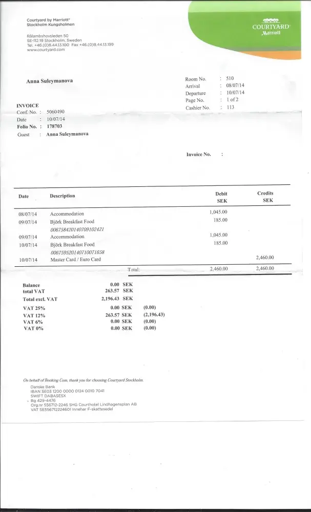 On July 15 I booked a hotel in Paris via booking.com for €437, 00 for Thursday, 18 July 2013 until Sunday, 21 July 2013.
