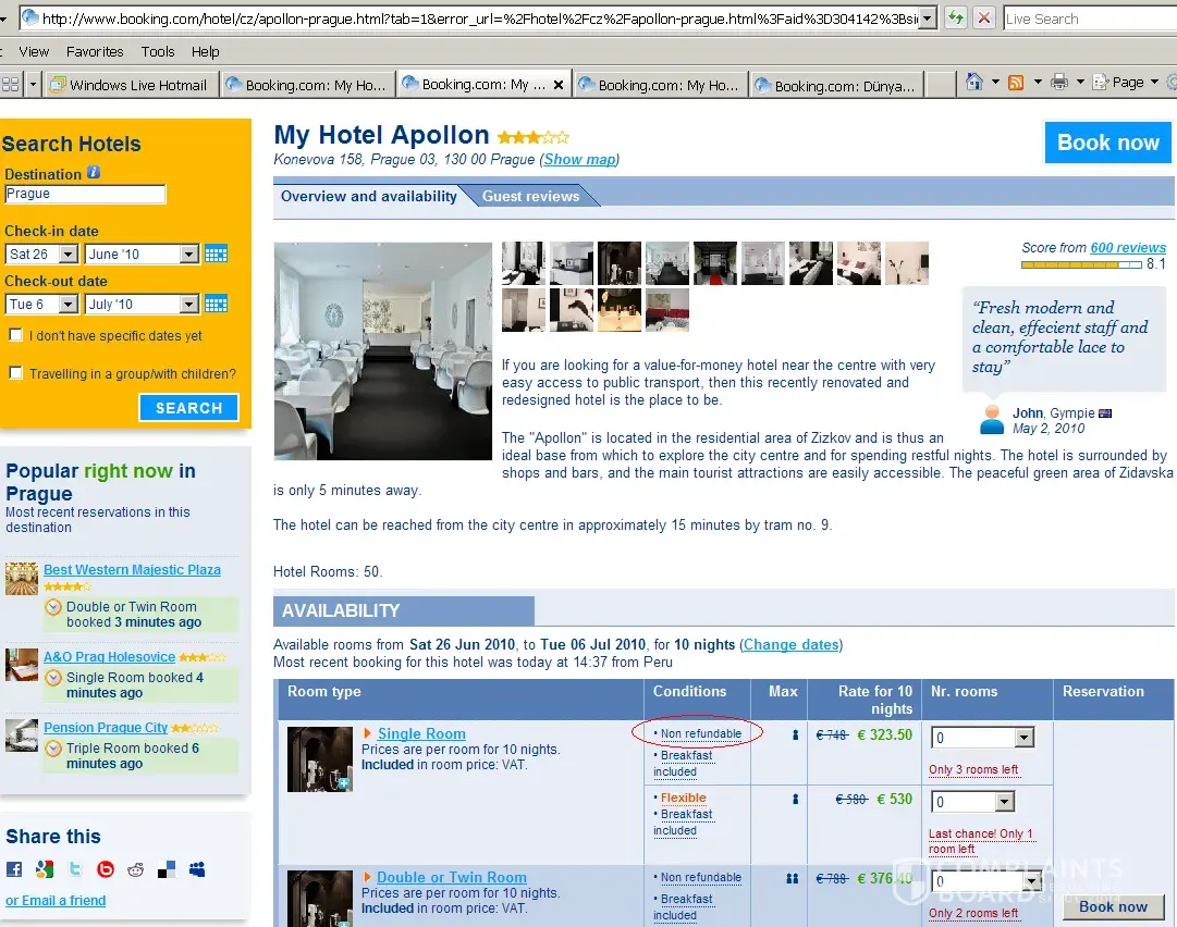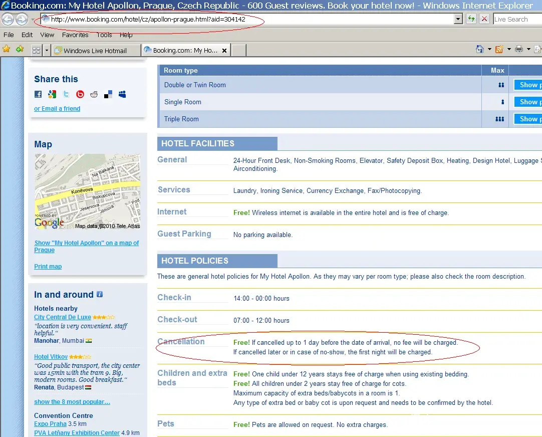 On June 2, 2010 I have made a hotel reservation from booking.com on behalf of a friend of mine who was planning to visit Prague and stay in My Hotel Apollon from June 25 to July 6, 2010. This reservation was necessary for her visa application before coming to Prague, and the reason that I chose Booking.com was its flexibility in the cancellation process in...
