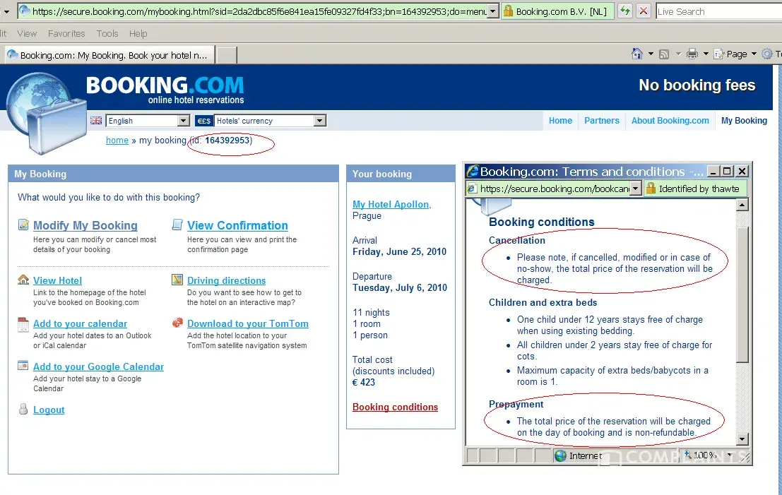 As you can see from the link: http://www.booking.com/hotel/cz/apollon-prague.html?aid=304142 and the screenshots that I attached, the Hotel Conditions section for My Hotel Apollon clearly states that no fee will be charged on the credit card until the 24 hours prior to the booking start date. Based on this information, I logically I assumed that Booking.com would prove a trustworthy site which could be relied upon not to abuse the sensitive credit card information provided. Unfortunately, this proved to be far from the case.