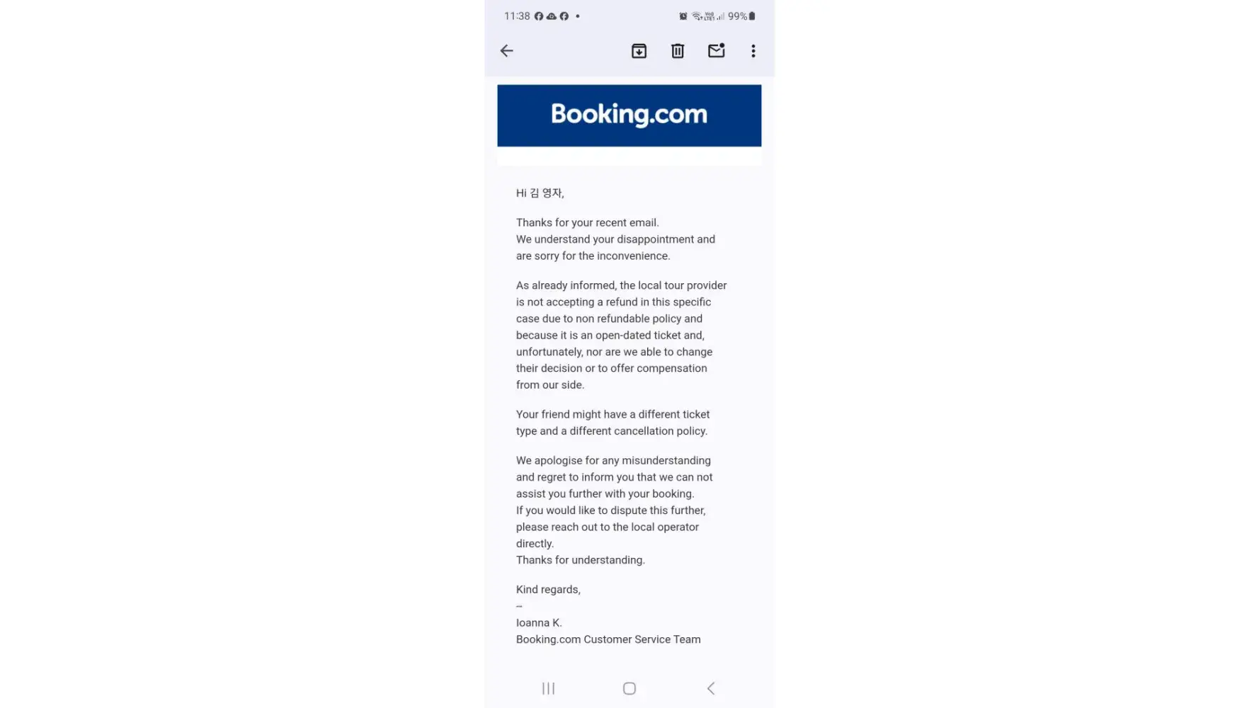 I got my booking cancelled 3 days before my stay, without any explanation at all. And the property was available for those dates after the cancellation, only for more money! I wrote to customer service, but received no reply at all. We were already in Corfu at the time, with everything booked including 3 day stay in Parga, and just left stranded