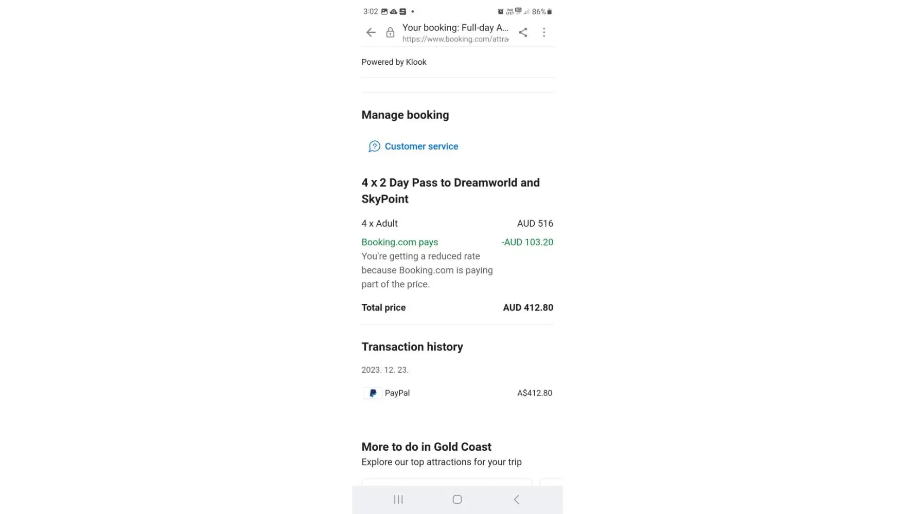 I bought tickets for dreamworld all day at booking.com . On the day we were about to split up, the park was closed due to weather issues, so we couldn't go. We live 10 hours away from there so we asked for a refund but they don't refund us.