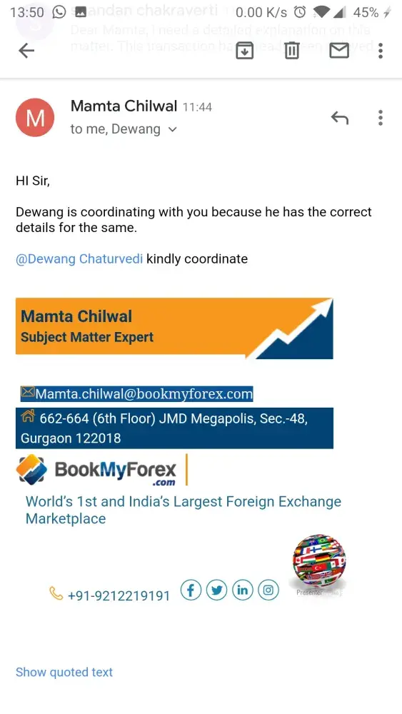 BookMyForex team promptly responded requesting me to upload the money by sharing the link with their preferred bank for online transaction and followed up multiple times. Each time they called up, the prompt response on their service levels were 4-8 hours timelines. Once the money is wire transferred, it is our responsibility to follow up since they got what they wanted, wooing one more customer. During wire-transfer process, BookMyForex website requested me to upload the proof of transaction of payment, which I promptly did however the team requested me to attach in an email, they said they called me multiple times at my India number, which is in suspended mode since I am in Singapore. I called the team and requested to contact me at my Singapore number for further interaction, which was non-courteously declined since they do not make any international calls. The big ordeal is that even after uploading the proof of my transaction and paying the amount upfront it has been 36 hours (9 times over and above the service level breach time) since without any action from BookMyForex team. I am using my India credit cards and paying huge money for every transaction as a service charge, including the conversion charges. I strongly feel BookMyForex do not feel for the customers facing issues in a foreign country and lack etiquette of customer service completely