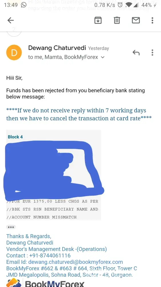 To the bookmyforex team: please expedite this process immediately. I also demand a legitimate reason and inquiry on the delay and cause of this mess.