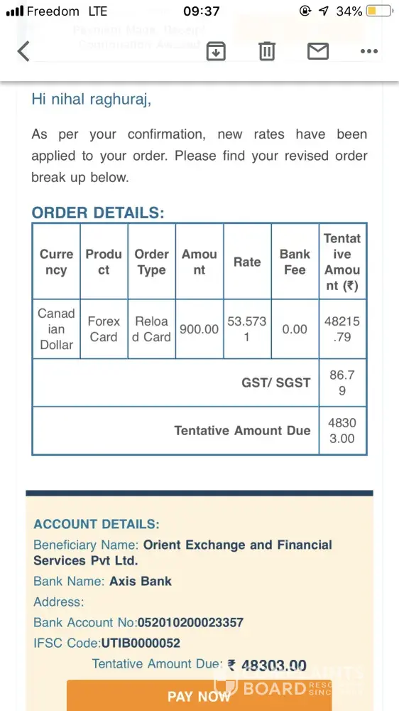 This complaint is regarding the Forex card - order FX161342311619.