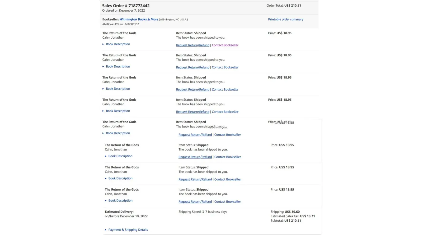 BE WARNED! Ordered eight books through AbeBooks, which they then confirmed the order had been forwarded to Wilmington Books & More. I have previously ordered books from AbeBooks and received them in a timely manner. NOT SO with Wilmington Books! I have sent repeated e-communications to both AbeBooks ("we are forwarding your message to Wilmington...