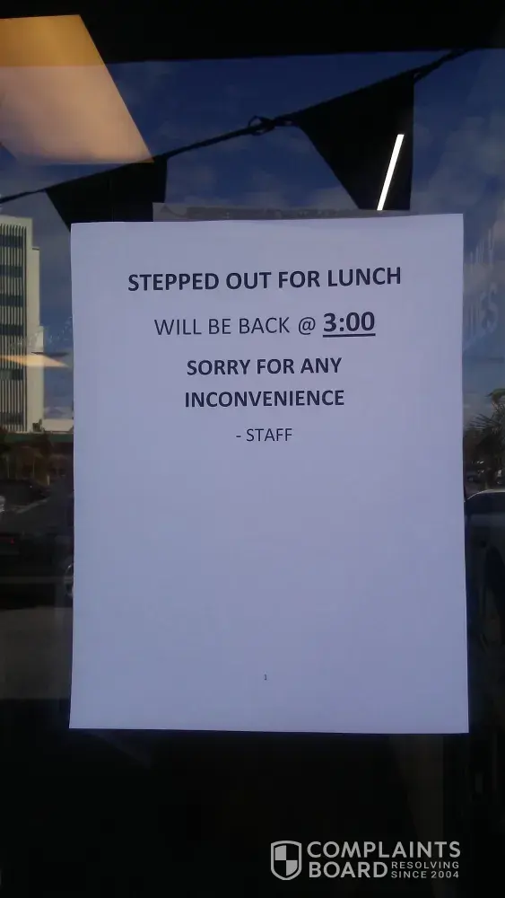 The store off of college way in burlington washington 98273, the manager and employees there always leaving notes that there gone or is taking a break. RIGHT NOW there is a note on the door stating that they will be back at 1:15 gone for lunch it is currently 1:33 and I have been next door at the vape shop waiting since 12:38