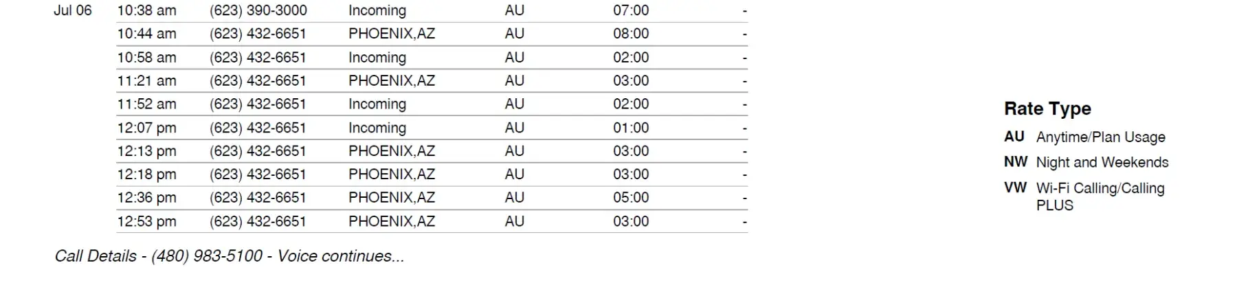 Attached is a partial call log file showing calls with [protected] which is based in Phoenix, Arizona. Attempts to have Boost Mobile provide the owner's name of the number have been unsuccessful since they protect their clients.