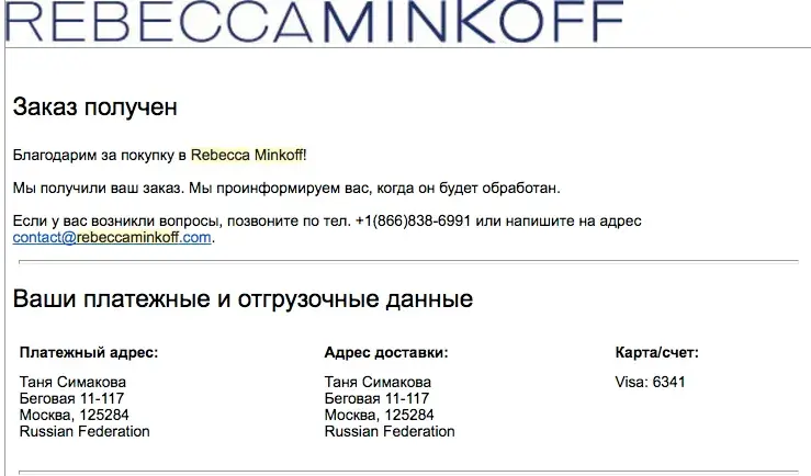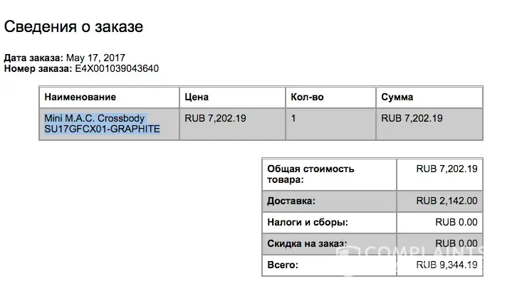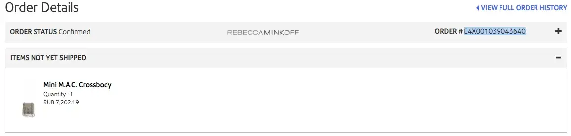 SU17GFCX01-GRAPHITE Rebecca Minkoff bag on May 17, 2017. The confirmation email stated that the delivery takes 17 business days. It has now been more than 6 weeks but the bag has not been delivered. My account, however, has been charged. The status of the order at the Borderfree website shows "confirmed". I emailed the store (at [protected]@rebeccaminkoff.com) but only got an autoresponse with no follow-up email. My concern is that the bag that I ordered is sold out at this point (judging by the website). In this case, I would like to request a full refund for the purchase that was not delivered. I am enclosing the screenshots of my order confirmation and order status for your convenience. Hope this can help get the issue resolved in a timely manner. Feel free to contact me via email [protected]@gmail.com or phone +[protected].