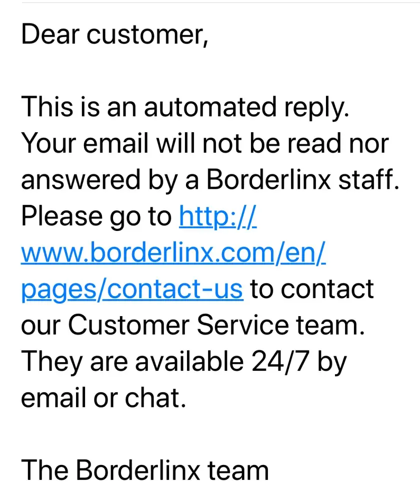 Borderlinx's so called ‘customer service ninja's' are a joke. You have to have the patience to wait in online chat for hours or wait for a min of 4 days for a reply to your email to receive a generic response... Repeatedly. There are no contact numbers and no complaints department... Big surprise.. Customer service is non-existent.