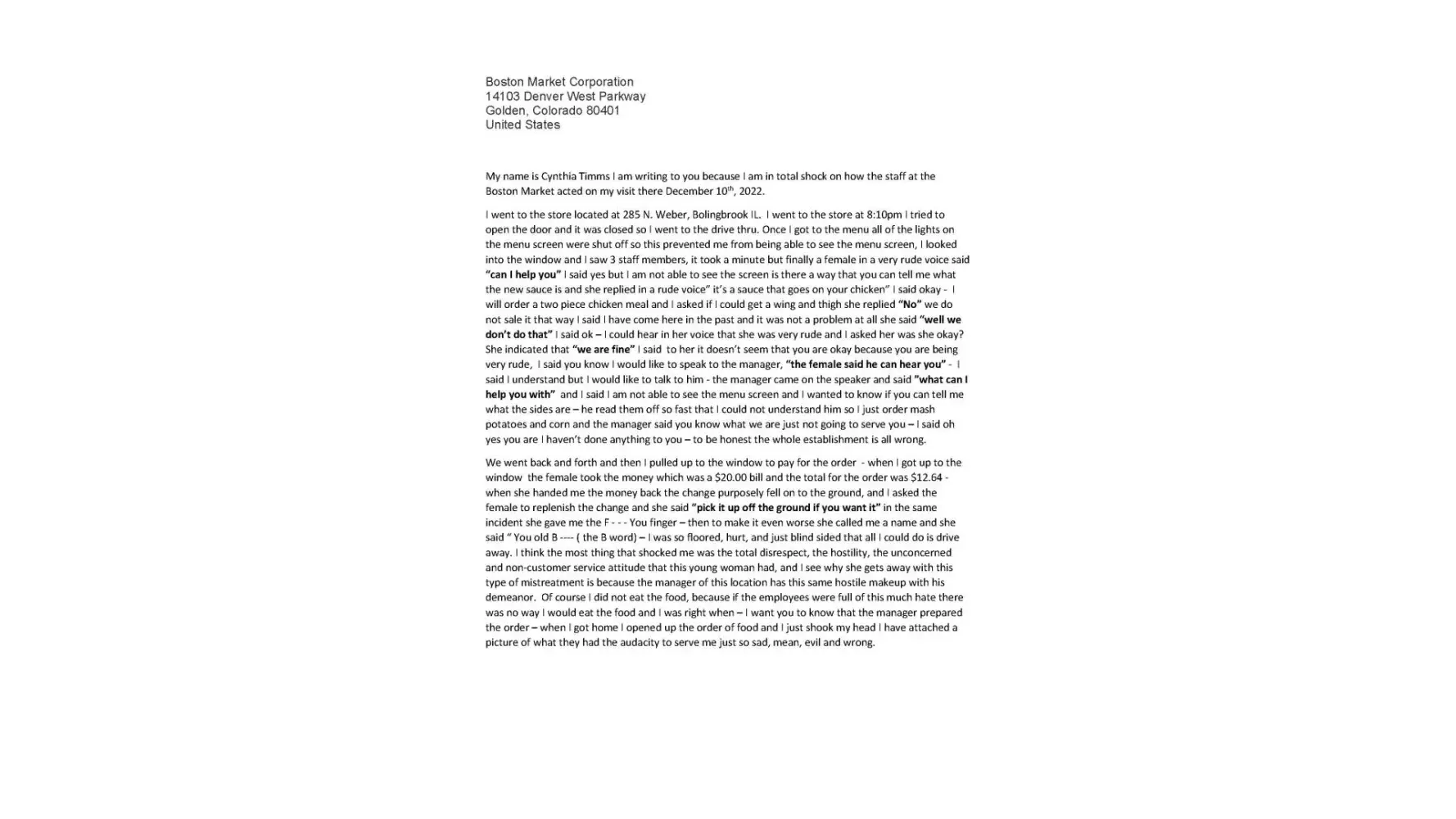 My name is Cynthia Timms I am writing to you because I am in total shock on how the staff at the Boston Market acted on my visit there December 10th, 2022.