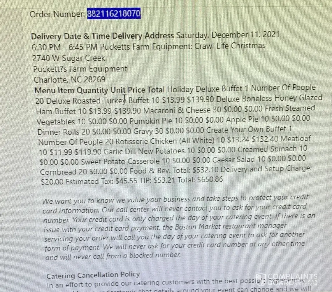 We placed a catering order for our company Christmas Party with the local Boston Market in Charlotte NC. We were told our food would be delivered between 6:30-6:45pm on Saturday December 11, 2021. However, Doordash delivered the food and delivered it after 7pm. The food was cold and we did not have any plates, napkins, serving utensils or silverware. We had to go purchase those items for our employees. We called to put in a complaint that evening and was told that someone from Boston Market would be calling us back that evening but haven't heard back from anyone. As a matter of fact, we have tried reaching out several times throughout the week with either a busy signal or just to be told a manager would have to call us back to speak about this. We are definitely disappointed as this was suppose to be a fun company Christmas party and it was a disaster. We would like to go about getting a full refund. Can someone please contact Melissa Falcone (owner) or Tracy Oxendine (Administrative Assistant) for Falcone Crawl Space to help us resolve this?