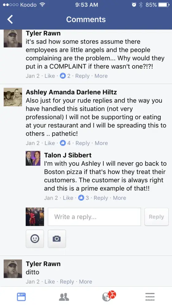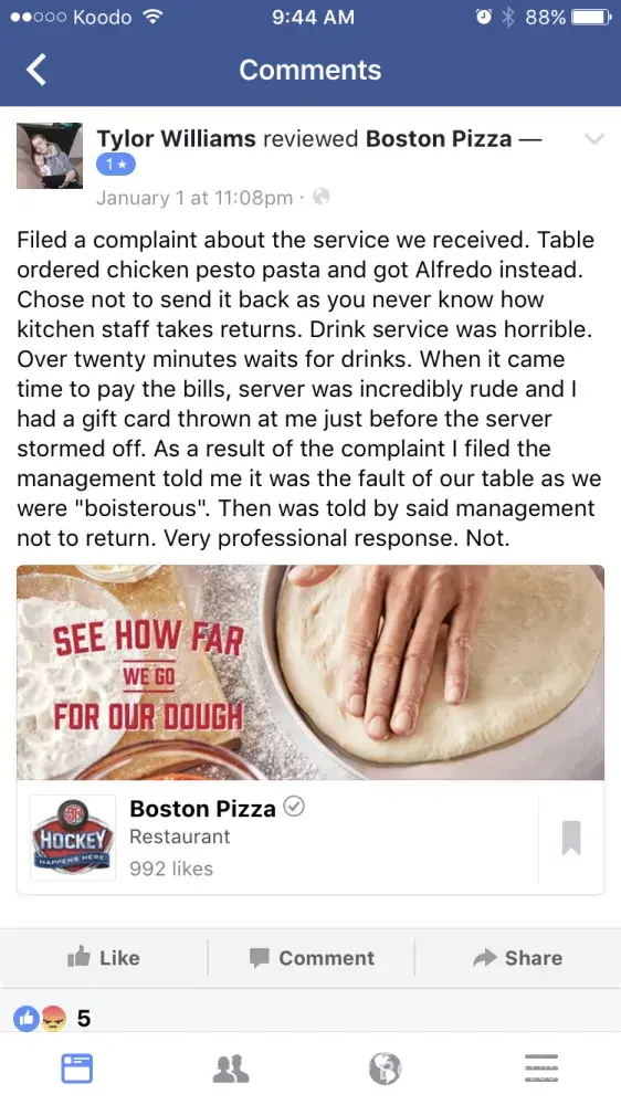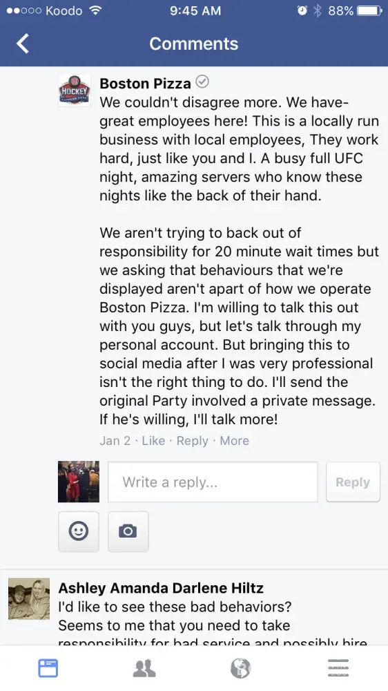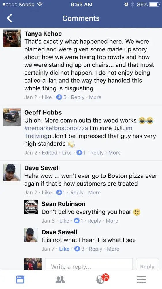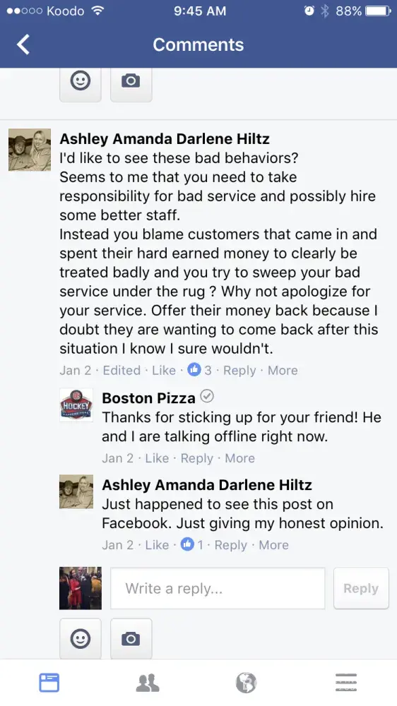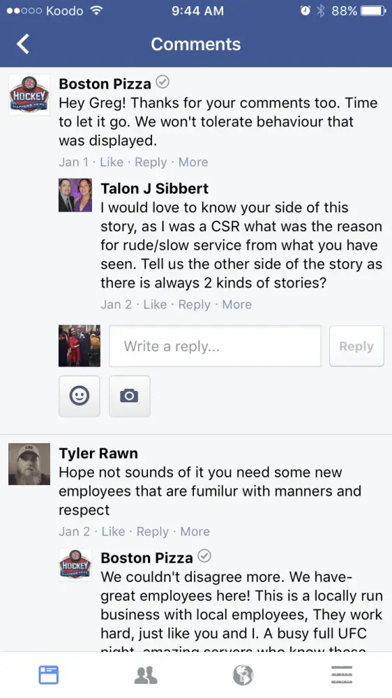 Boston pizza employees being rude over Facebook due to people complaining about the service and food they received. The restaurant kick the people out when they are confronted of their rude and slow services, and try to blame it on the customer. We pay our hard earned money to eat there. And sorry, majority of us don't have time to 'stand on the tables' we have children to watch. Unfortunately this isn't the first time they've blamed customers. I would suggest checking video footage for future reference. It needs to be looked into and something needs to be done.