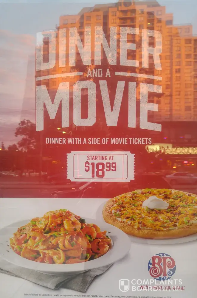 I would like to point out a highly deceptive BP advertising poster that caused my guest and me to leave the restaurant and go elsewhere. The deceptive ad says "Dinner and a Movie - Dinner with a side of movie tickets." Starting at $18.99. This leads people to believe that dinner is for 2 people and tickets are included at that meal price or above. This was not the case. Luckily I asked in advance and was told that the tickets were an extra expense and the price was for one person. We left highly upset at almost being taken in and went elsewhere to eat. I can get seniors movie tickets at the price we were offered and lower. We saw it as BP was not offering any kind of meal deal and the ad simply lures people in and deceives them. Just advertise that theatre tickets can be bought when ordering a meal. Not this phony lure. This is a new BP in my area and I am highly disappointed at this tactic and will not be recommending anybody else to go to the restaurant, and will now have to warn them about such deceptive lures. It is difficult enough to avoid being scammed anymore and it is necessary to ask questions constantly to get the truth. This is the first time that I have come across this kind of situation and BP now falls into the lines of the scammers I have to watch. Please change the ad or just get rid of it. You are not offering any kind of deal.