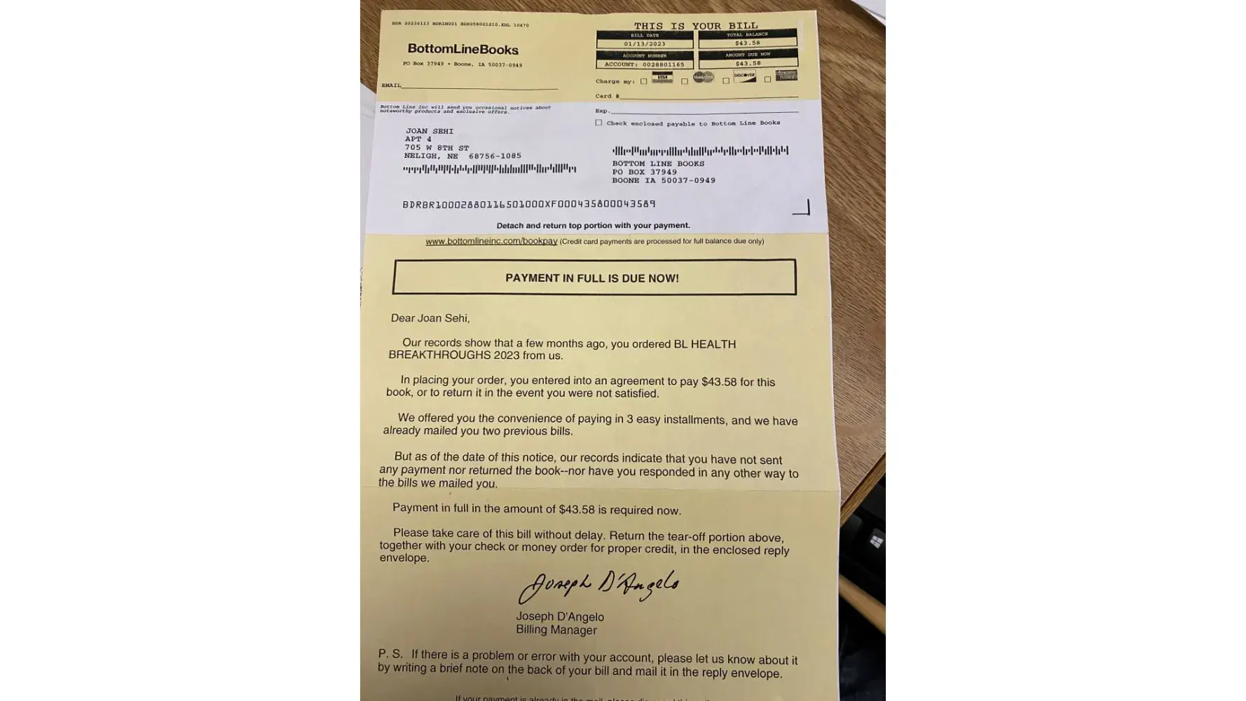 I bought a book from Bottom Line in 2019. I was disappointed! The information they promoted as "new discovery" was one pill for my vision I had been taking for a while. But, OK. My surprise was next year, I received another unsolicited book. I just can't believe the abuse with older people for whom sometimes to find a way to return and item, is not so easy. What a big fraud! Then, they start sending letters for you to pay a book you don't want, you didn't buy … you are not interested at all. I finally, found a way to communicate with them, and the person at the phone asked me to send the book back, which I had to pay to do so as I had opened the box to check what was inside. She said all will be OK with me and The unsolicited book. I sent the book back. No immediately as it is not easy to me to go to the post office and do the long lane, after sending the book, I thought I had finished with that nightmare. I was wrong. Bottom Line gave my acct to a collection company because they want me to pay $48.55 for the book I didn't buy and I had already returned. . They hit my credit score 7 points down and are harassing me with letters asking me to pay. What a fraud and a terrible company.