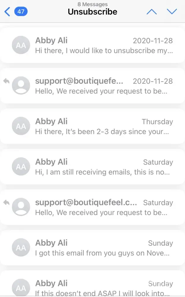 I've tried to unsubscribe from boutiquefeels emails however the option does not work. November 28th, 2020 I tried to contact them via telephone but of course their contact number doesn't work either. I sent them an email asking to be unsubscribed from their mailing list - I got a response saying it will take 2-3 business days. It's been well over 2-3 business days now and I have sent them multiple emails since asking them to remove my email and sometimes they would respond with the same email or not respond at all.