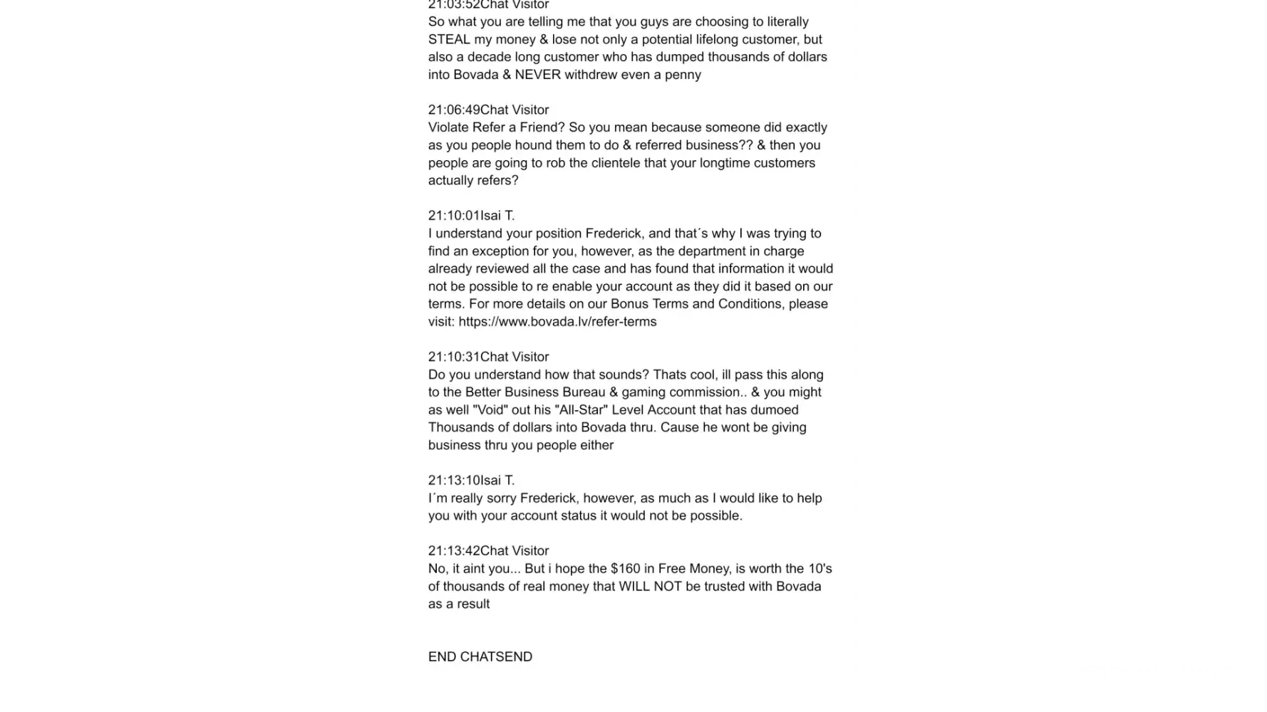 I am a decade long, "all-star" level bovada customer... Have deposited probably 100 times, 10's of thousands of dollars... Never withdrew a penny from them. Fast forward to lastnight.. My recently turned 21 son-in-law who isnt familiar with, nor has ever even heard of bovada previously... So I bring him up to speed on the online sportsbooks, and help him to set up the account.. And then waste my time assisting him with going about creating a accounts and means of accessing bitcoin and everything else... Now of course given their constant promotion of, and insistence towards "referring your friends" "bring you friends", etc.. That they drill you will over and over again on their site, thru your email, or anytime you speak with an agent.. Once would imagine that is because they actually would like to promote gaining clientele and adding business.. Only thats not the case whatsoever... In fact they want you to be the person to lure someone in for them so that they can willingly accept their deposit... Only to turn around mere hours later and close out and void the account and as such, blatantly rob those of whom you have referred to them.