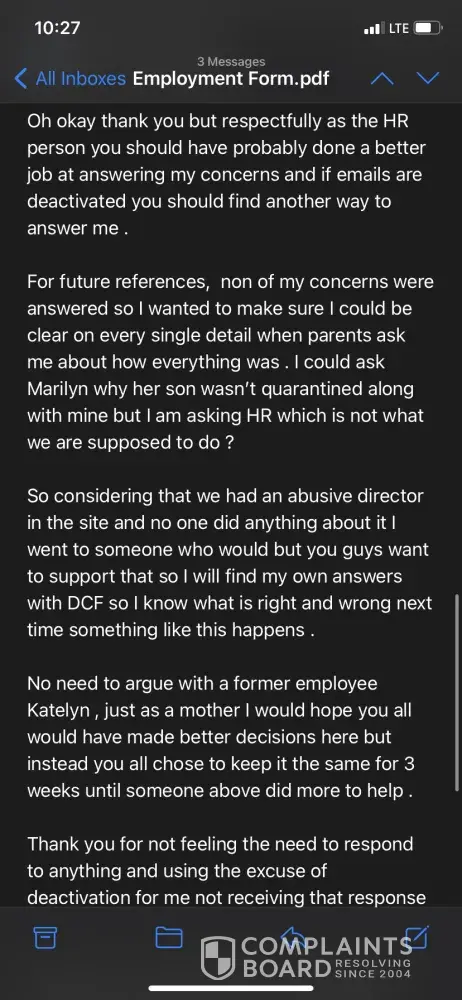 I worked for BGC for a little over a year and a half, January 2022 would have made two years. This coming school year a director was hired that was abusive to the children, rude to parents, scared the older children etc. She yanked a one year old from my classroom by her arm and threw her to the ground, wanted to send another child home with a "temp" and he did not have one, called a boy with autism an idiot for crying his first day in a VPK structured class but he is only 3 years old with an IEP so he is apart of that inclusion classroom. A few more incidents that were very sad and many of those incidents were reported by both me as a staff and by the parents themselves. Nothing was done after 3 weeks of this and I had already handed in my two weeks. I decided to go to the principal of the school since we are in the back portable and no one above me was doing anything about this. The principal asked that the CEO to remove this director immediately or she would not need BGC in her school ever again. Parents even had a meeting with the CEO about the situation and having the director removed as well. The CEO and HR were very upset about this and took it out on me because of their actions, them not doing something about it after multiple complaints was very sad. They wanted to send me to another site my last four days to "avoid any more conflict" which meant they wanted me to speak with no one. Also informed me that when an employee resigns from a site they are no longer allowed on the premises and that includes their children... No other employee was ever told this and I had their emails to prove it . I ended up quitting 4 days earlier than my two weeks and I emailed HR and had interactions that were not okay and that lead to my son being kicked out of the preschool he was attending because of "conflict of interest with parent". I left 8/30/2021 and on 8/31/2021 my coworker that complain early august was asked to finally write up an official report about the situation which was a little strange and a little late to do. It was all very unfortunate and I would honestly not recommend any parent to go to their preschools ever again. The CEO was a new one and supposed to be good but yet she has not done much good for the employees and children personally. I was raised to $11.76 an hour and new co workers that weren't doing anything, being lazy, trying to have the babies sleep all day etc are getting paid 30 cents less than me . They should actually train and observe the people the bring in to care for babies and be considerate of these parents that trust these facilities to take care of their children. I have attached the screen shots of the emails that were sent between HR and I . Im not looking for much of an outcome from all this, I just want them to do better and put more effort into the company and making it successful . There are many complaints and it is sad that for what BGC stands for it all seems to be a lie at the end .