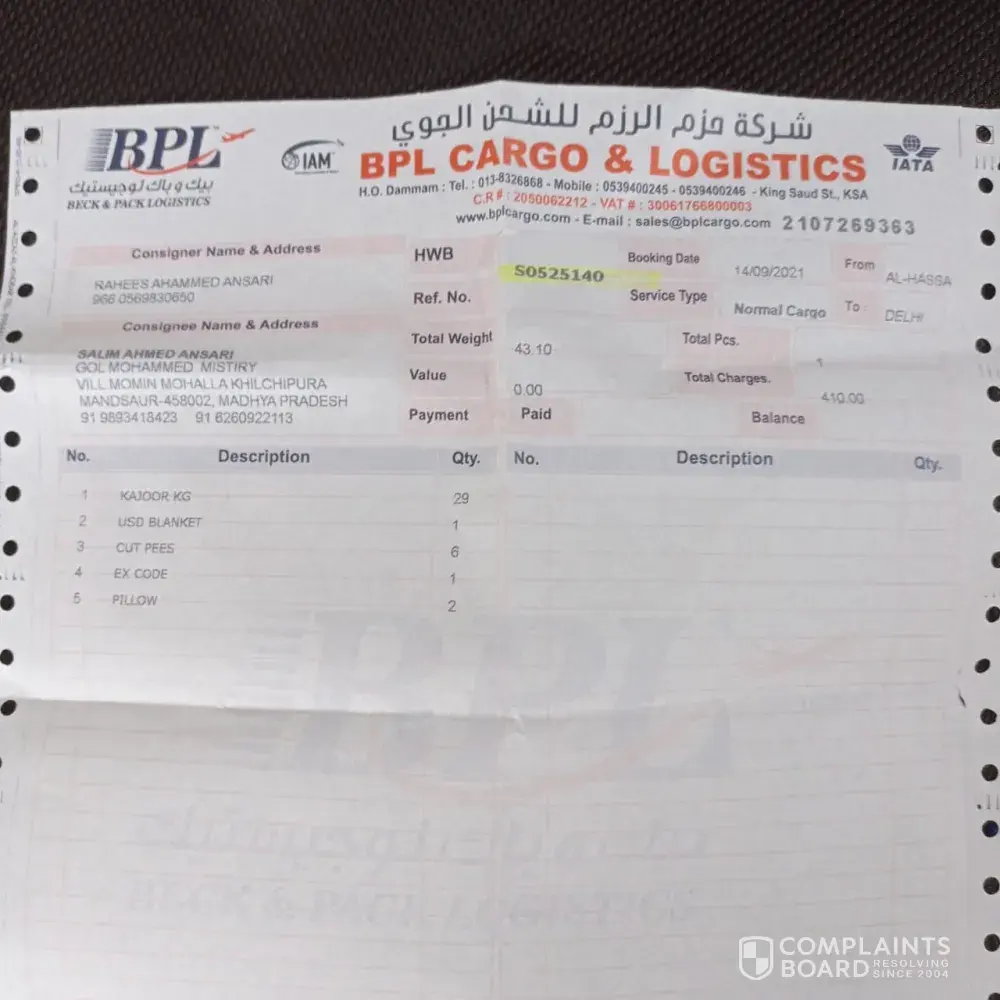 Worst service of bpl cargo...my cargo tracking number is S0612905...it was send from AL.khobar Saudi Arabia on 1st June 2021 and now it's 5 months 12 days and still the status is same...