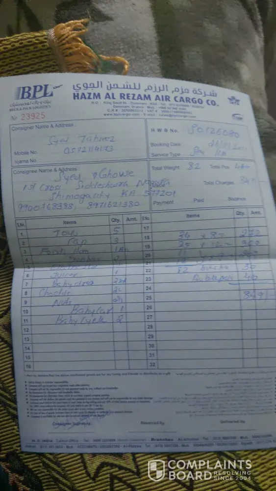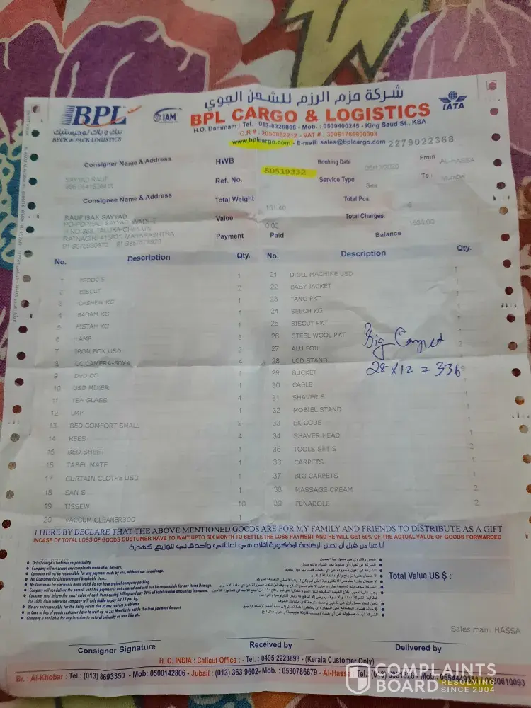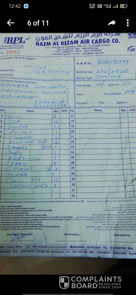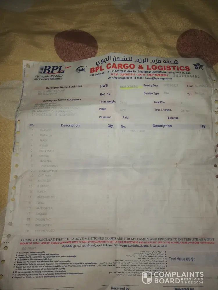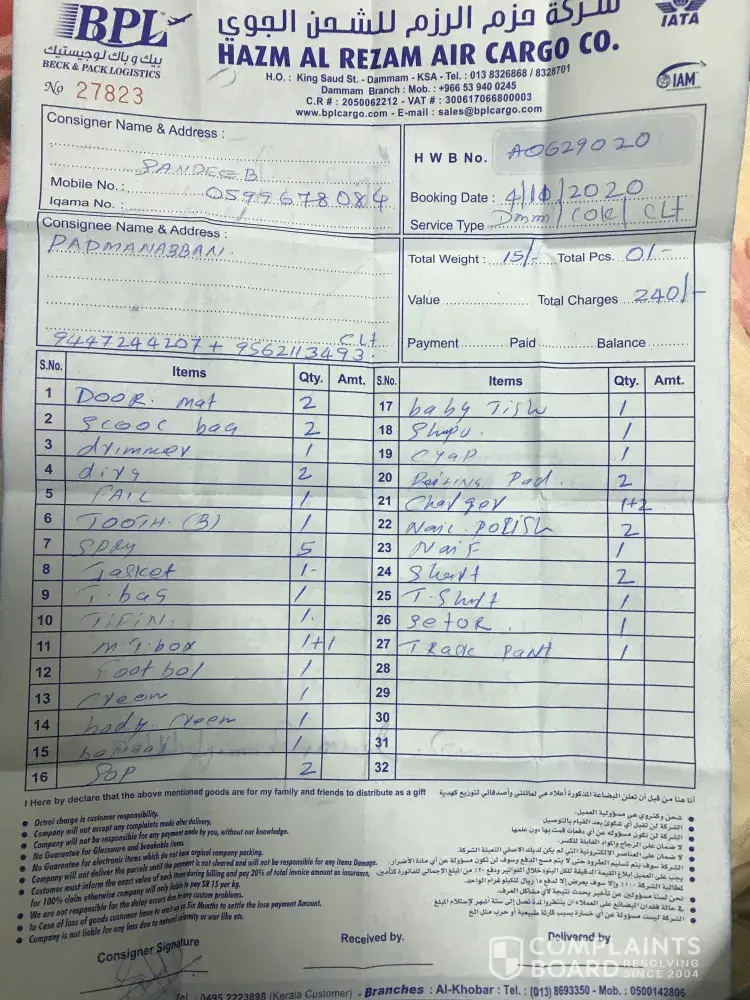 I am speaking from saudi arab Damam Al Hasa. We sent some goods from BPL. Cargo on 5 December 2020. It has been 4 months so far. So far, some things have not been found at our house, so we want you to help ðŸ™ðŸ™ðŸ™