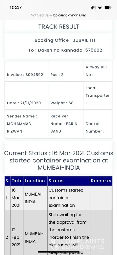 S094892 Jubail, Saudi Arabia to Mangalore, Karnataka Packed date 21/11/2020. Status still under customs. I am not a fool that you pay container delays charges till the date for our material. If my cargo doesn't reach before 21/05/2020. I will file complaint in consumer court of Saudi Arabia as well as legal case from India too. Enough is enough.