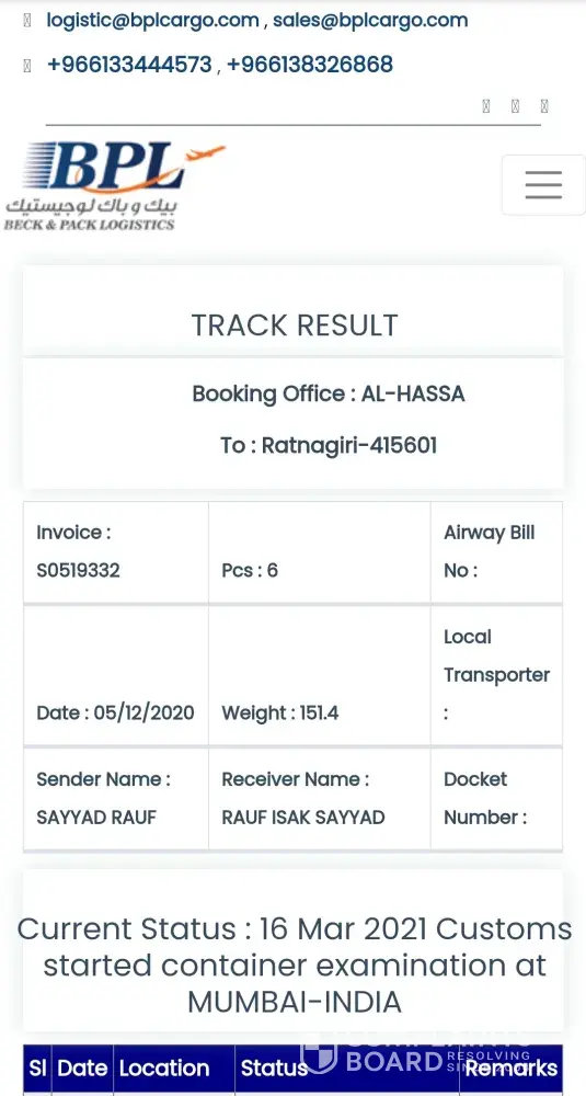 Dear sir my shipment invoice no S0713715 date: 07-december-2020 was suppose to be delivered from Saudi to India in 60 days but now its been more than 4months and the status is still pending.. As per the courier office all containers have been hold by customs but its been there since long time. Kindly arrange representative from bpl cargo to clear customs ASAP.