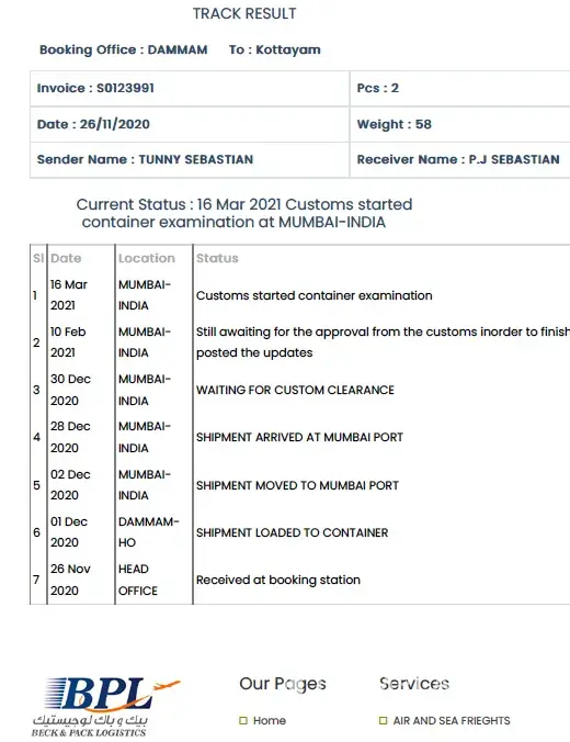 On November 4th 2020 as per phone conversation one driver came from BPL cargo Al khobar branch one Mr. Vydhi. When he arrived my flat door he told me to bring his tools to inside my flat where leg gauges placed. As formal communications I asked him is it any office available for BPL cargo in Calicut?
