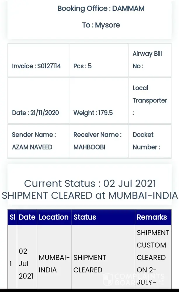 Invoice number S0127114 from Dammam to India - Karnataka Mysuru - I didn't receive my Cargo since November 2020