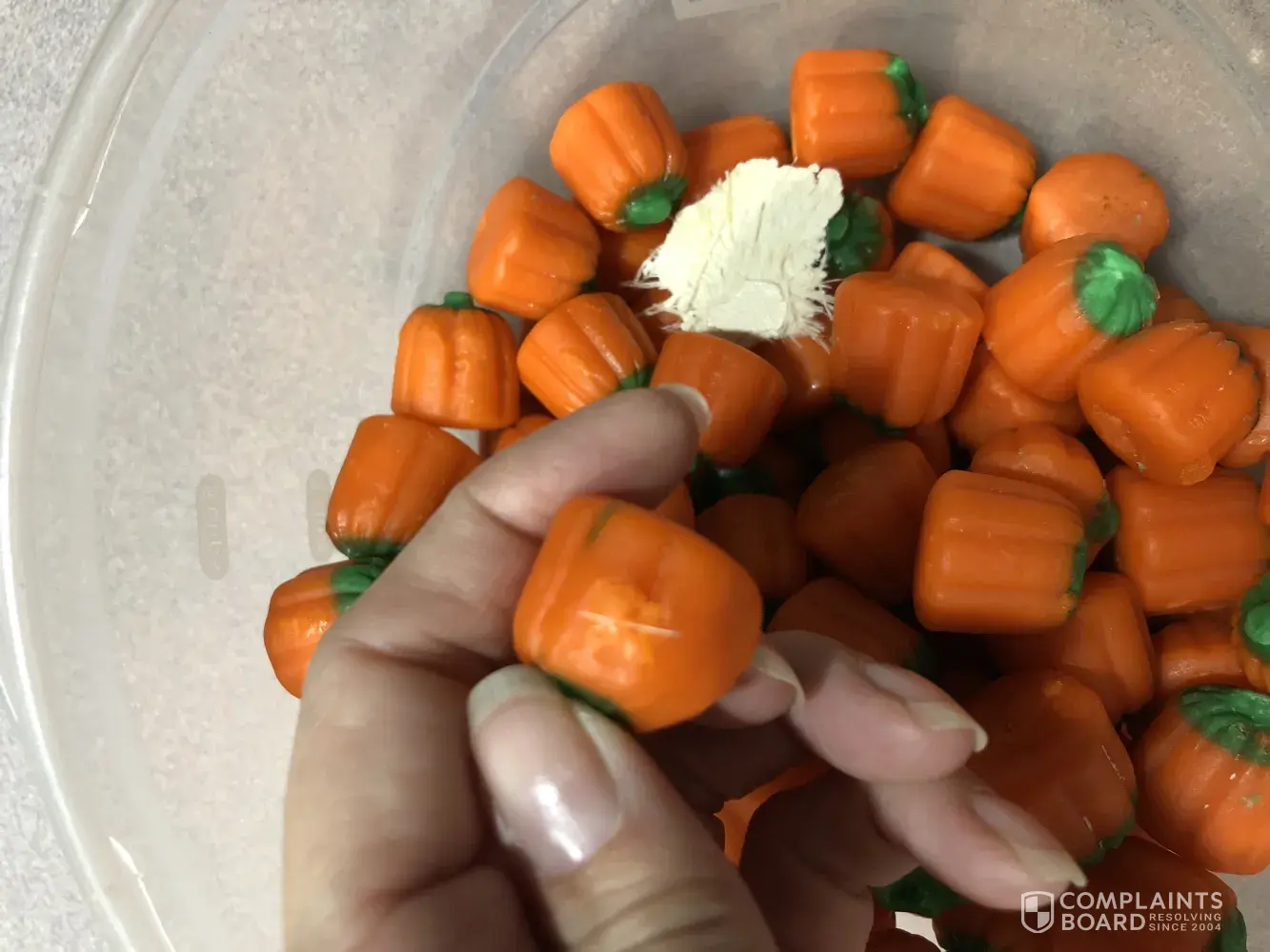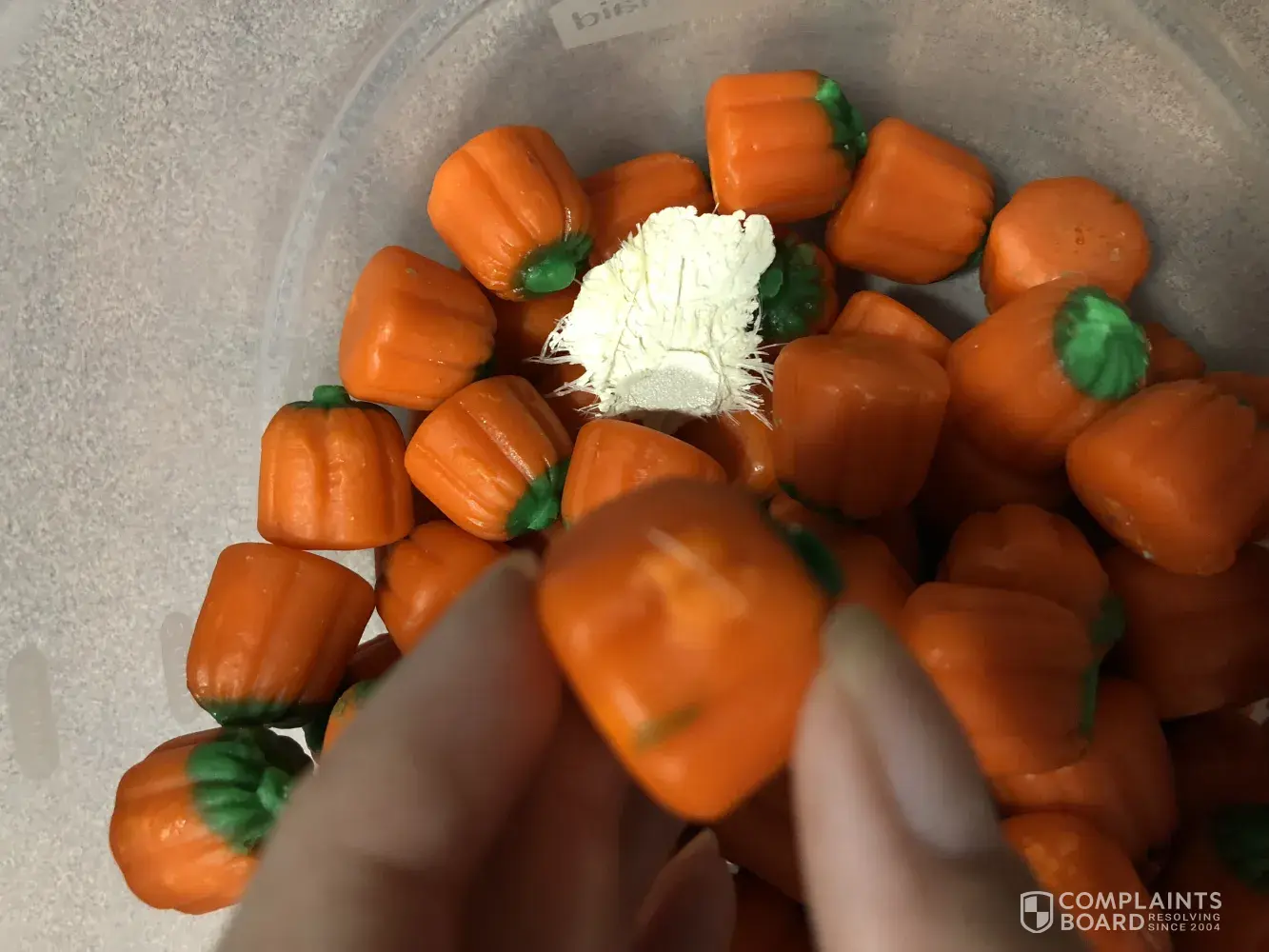 I brought a sack of pumpkins, which are one of favorite candies next to candy corn. Half way though the sack, the bottom half of the sack was all stuck together and they felt sticky.