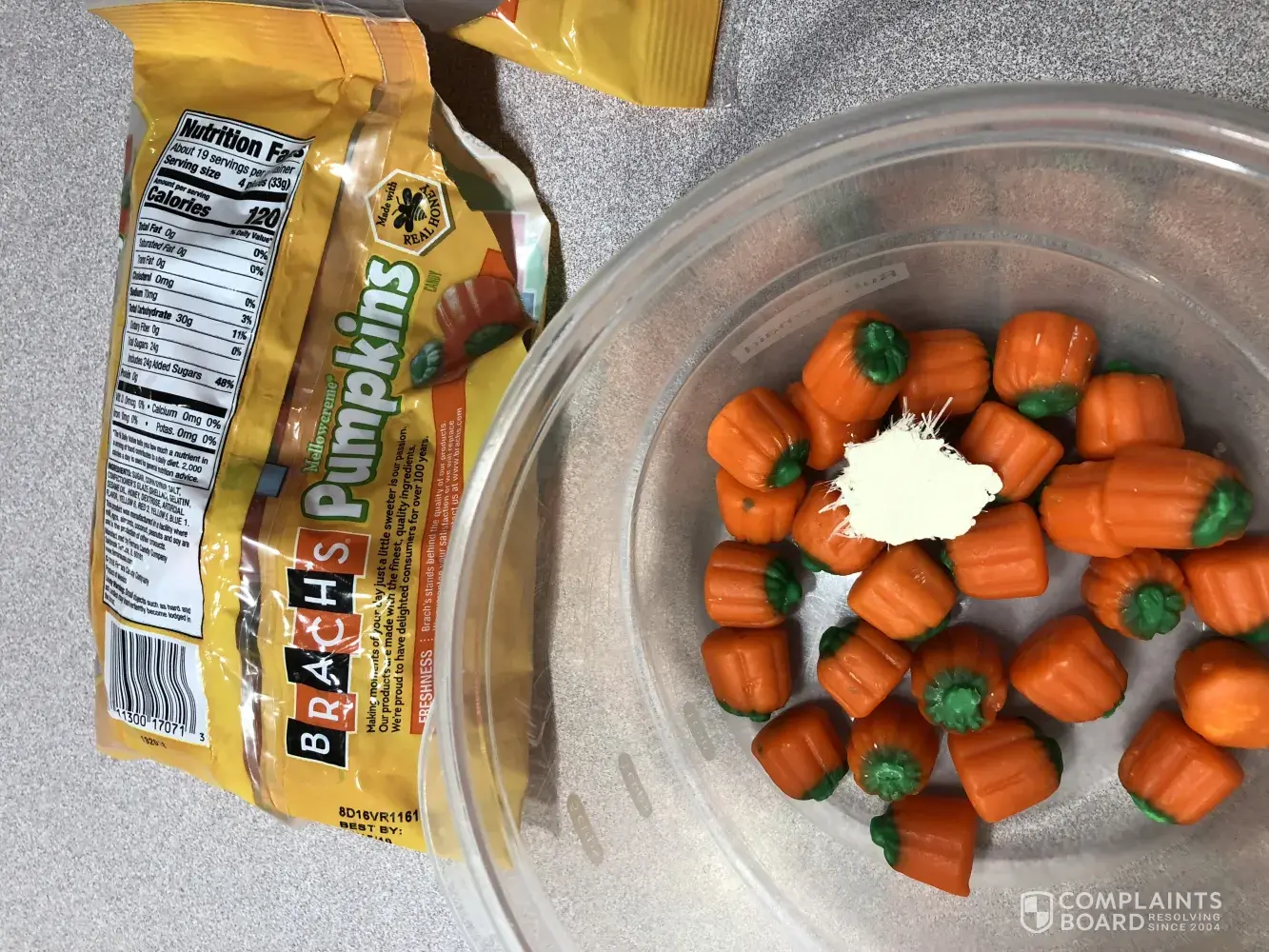 I purchased a bag of pumpkins and when I poured it into the bowl to make a fall trail mix a big chunk of something came out. It looks like some kind of wall or fiber board painted white. It is larger than a fifty cent piece. I was shocked and disgusted. I have attached photos. I thought it best to notify you for safety reasons. I included information from the bag. What could this be? I would like a reimbursement at the very least. Thank you.