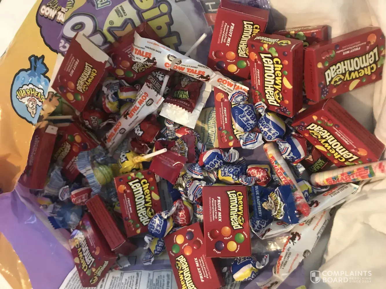 This bag is supposed to contain chewy lemondhead mix, Now and Later, sour lemondhead pops, originals lemondhead, warheads, super bubble, smarties & cowtails