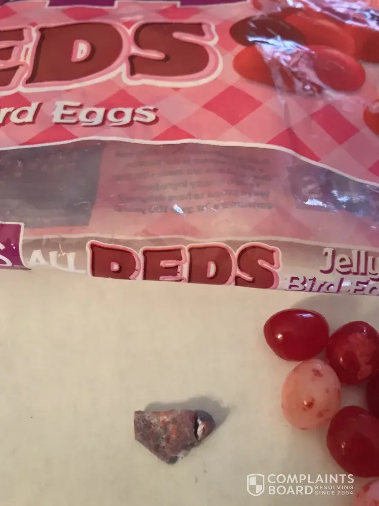 I found this foreign object in the bag when I went to pour them in a bowl. I did not want to jeopardize anyone's health. I would like to be compensated for for this products inferior quality. Thank you . I don't know what else you want me to say but there was a foreign object in my bag of candy simple as that all you are doing is making it more complicated than it is . Resolve this or I will give it to a lawyer, thank you