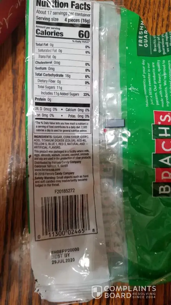 Recently purchased a bag of Brach's Classic Candy Corn 11 oz. Candy is melted together in balls and broken up in smaller pieces. Purchased from Dollar General in Bull Shoals AR. The expiration date is 06/06/2020. The numbers under the bar code is [protected]. Not only were we VERY disappointed in the quality and condition of the candy inside the bag but that it is also a product of Mexico. Obviously the quality control is not under control.