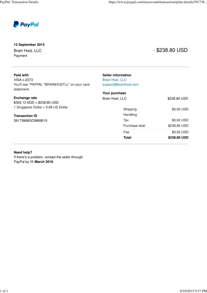 My Brain Host hosting plan was due for renewal on 7 Sep 2015. I was not happy with their service at all due to frequent down time. When I subscribed to Brain Host, I paid using Paypal and I had added Brain Host into "My Pre-Approved Payments". I saw a failed payment notice in my Paypal. So, I sent BrainHost an email to stop the auto-billing. I was not aware of the "Pre-Approved Payments" feature in Paypal. So, on 20 Sep 2015, I checked on my Paypal account, and found that BrainHost had successfully charged the renewal of USD238.80 on 12 Sep 2015. So, I wrote an email and open a support ticket to ask for cancellation and refund. According to their refund policy in their Terms and Conditions, there is a 30 Day Money-Back Guarantee on all shared hosting plans. I got a reply from Adam R, "Per your request, we have cancelled you account but we cannot offer you a refund. Please let us know if you have any questions." So, I asked for a reason for not refunding to me. I did not get a reply from them at all.