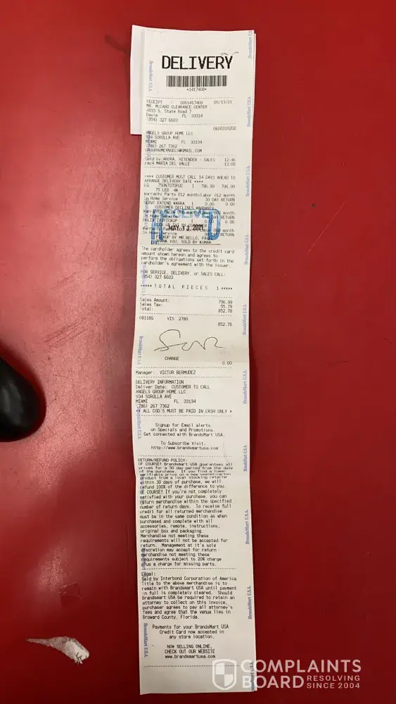 I purchased a refrigerator at BrandsMart USA. I bought the five-year extended warranty after being told by the salesperson how critical it was to purchase a five-year extended warranty due to the high cost and complexity of the Samsung refrigerator. I paid $3349 dollars. I reported to BrandsMart USA a catastrophic malfunction of my refrigerator. After multiple failed attempts to fix the fridge, I am still without a working refrigerator. It is almost six months since the report and I do not have a working refrigerator and there are multiple days waiting for the techs with significant loss of income.