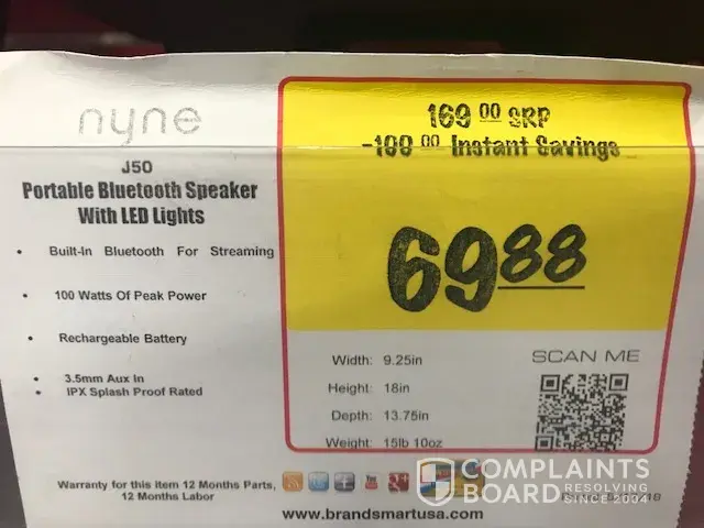 On June 5, 2018, I went to the Brandsmart Store located at 751 Executive Center Dr, West Palm Beach, FL 33401 with my family looking for a Bluetooth speaker. After looking at a several speakers I found the specific item I was looking for. I saw a J50 Portable Bluetooth Speaker with LED lights, marked at $69.88.