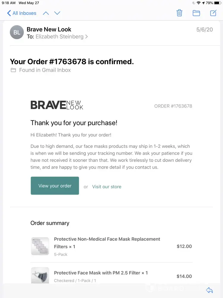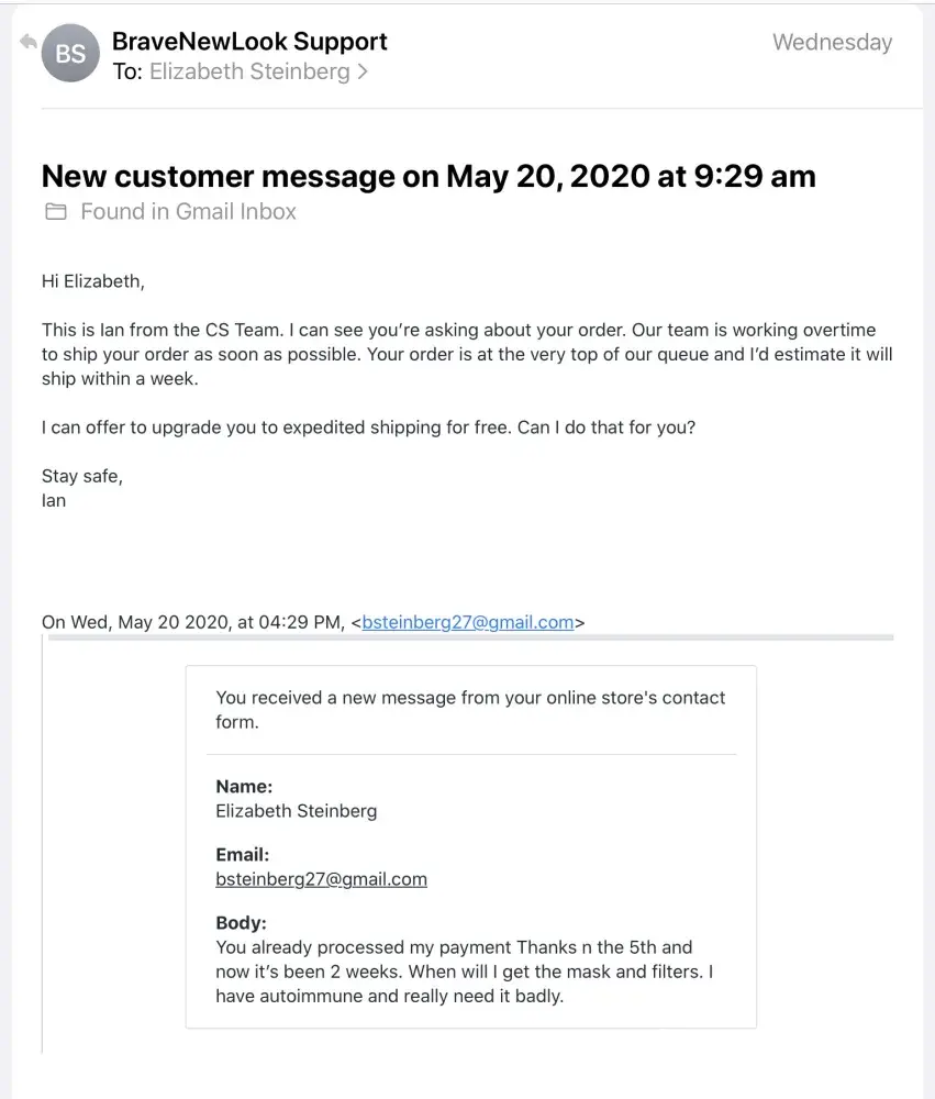 Shortly after placing my order on May 6th I contacted them asking about my order and also about adding another mask. I received a reply on 5/24 giving all kinds of reasons as to why I haven't received my mask/filters yet and that they would mark it priority shipping and it would possibly go out this next week. After reading this I went online and read 350+ bad reviews saying that others hadn't received anything and they were sent the same info. They warned that this is a scam. I'd like to believe that they are just in the weeds and that they will come through but after reading all of that it has me concerned. I launched a case with PayPal to get a refund and surprise, when Brave New Look was contacted by them they have now marked it as shipped. Funny thing is that it still hasn't moved and it's five days later. I do not want a mask from this company I want my money back! Within the time it has taken waiting for this mask I have ordered several others from other companies and they have all arrived. On the site it shows that if you order a mask today that it will go out next week. I find this frustrating because I ordered mine a long time ago and I still don't have it. Empty promises. I WANT A REFUND...PLEASE TAKE CARE OF THIS! Oh, by the way the phone number listed has been disconnected.