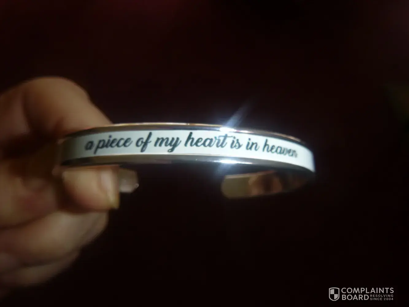 Received my bracelet today — omg, it is just a piece of cheap metal with a sticker on it, with the saying "a piece of my heart is in heaven". A sticker on the bracelet, no engraving! Paid a total of $24.98, which included shipping, for this piece of junk. I was to give this to my niece after the death of her father and brother last year... I am embarrassed to do so now! Don't buy anything from this company!