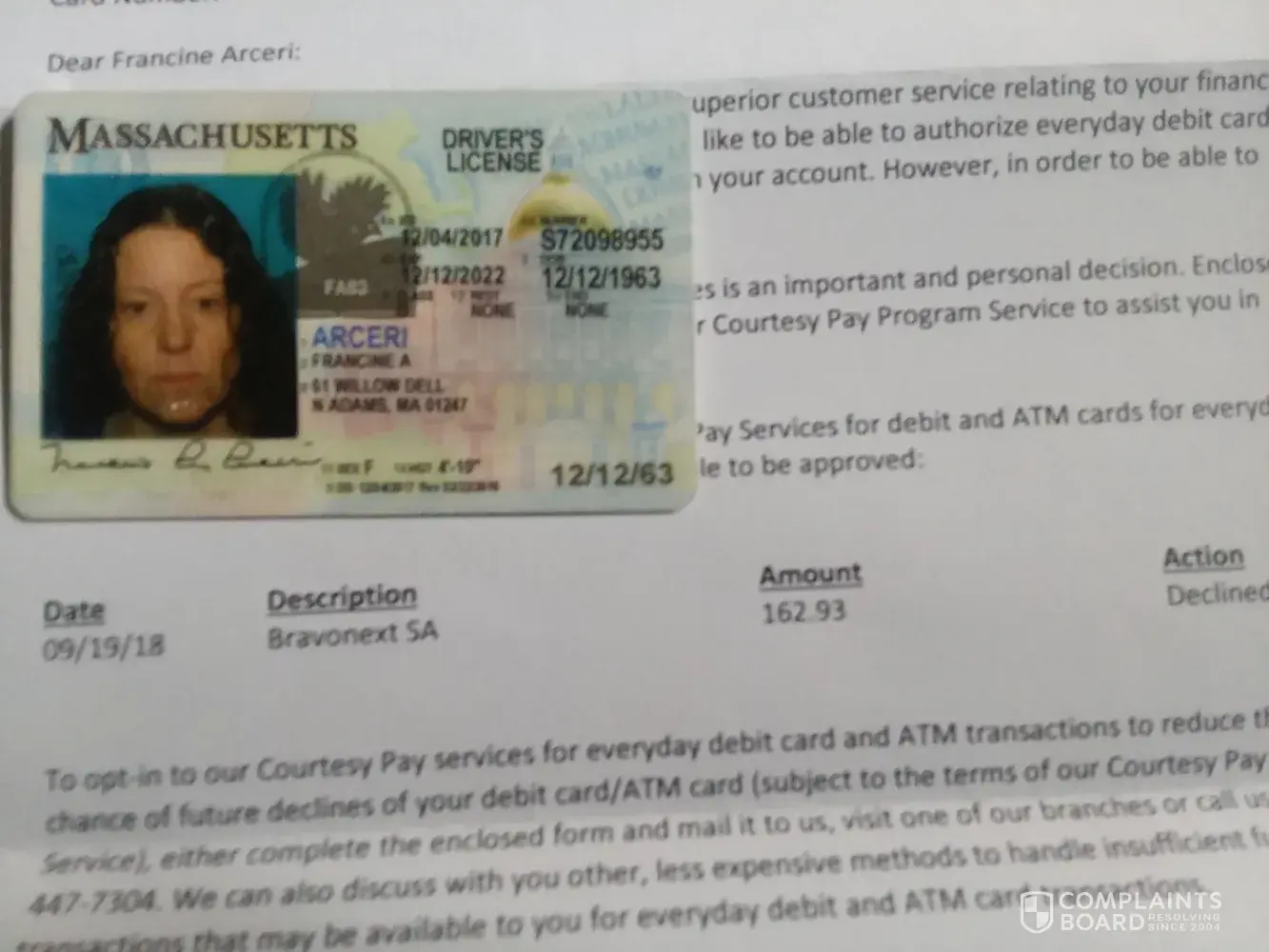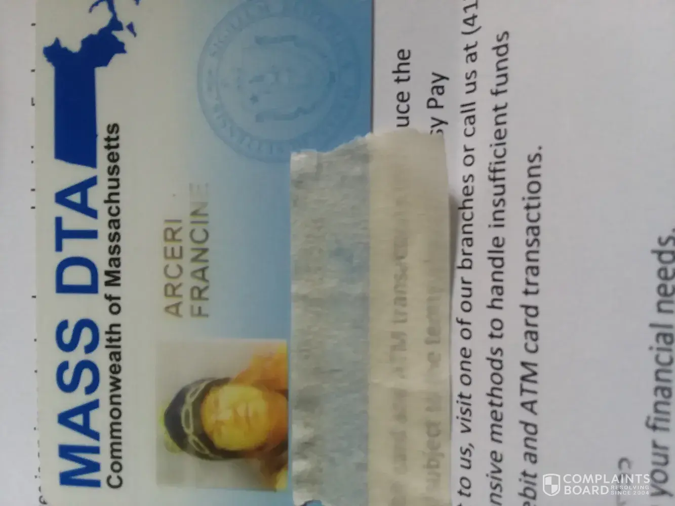 My name is Francine Arceri and someone opened an account in my name. His name is Samuel Takyi. I can assure you I did not open an account with you. Please close this account immediately. I'm sending a picture of my license and my food stamp card as proof of my identity I had to cover up the numbers on the food stamp card.